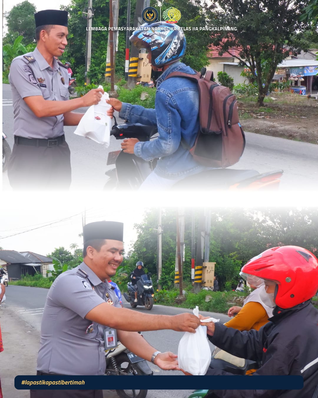 PANGKALPINANG, - Lembaga Pemasyarakatan (Lapas) Narkotika Kelas IIA Pangkalpinang membagikan 100 paket takjil kepada masyarakat di sekitar Jalan Raya Lintas Timur II Selindung, Selasa (18/3). Kegiatan sosial ini digelar sebagai wujud kepedulian jajaran Lapas dalam menyemarakkan bulan suci Ramadan.